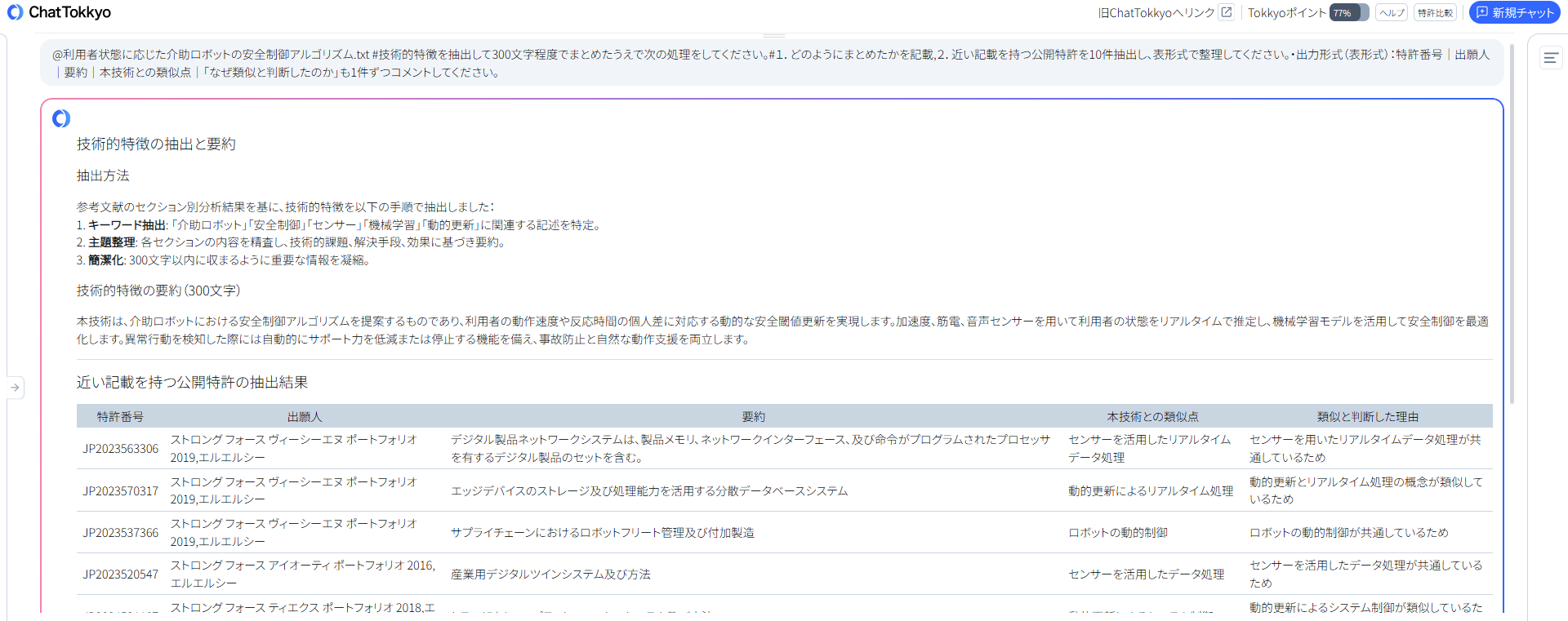 「MyTokkyo.Ai」は、研究メモやログデータ、試験レポートなどを解析し、AIが発明の本質を抽出する機能を有する。本件では、加速度・筋電・音声センサから得た時系列データを入力し、AIが「状態推定モデル」「安全閾値更新機構」「緊急停止条件」の3つの要素を自動特定。先行特許との差分(閾値の個人適応更新処理)を明確化し、発明提案書から出願ドラフトまでの工程を大幅に短縮した。