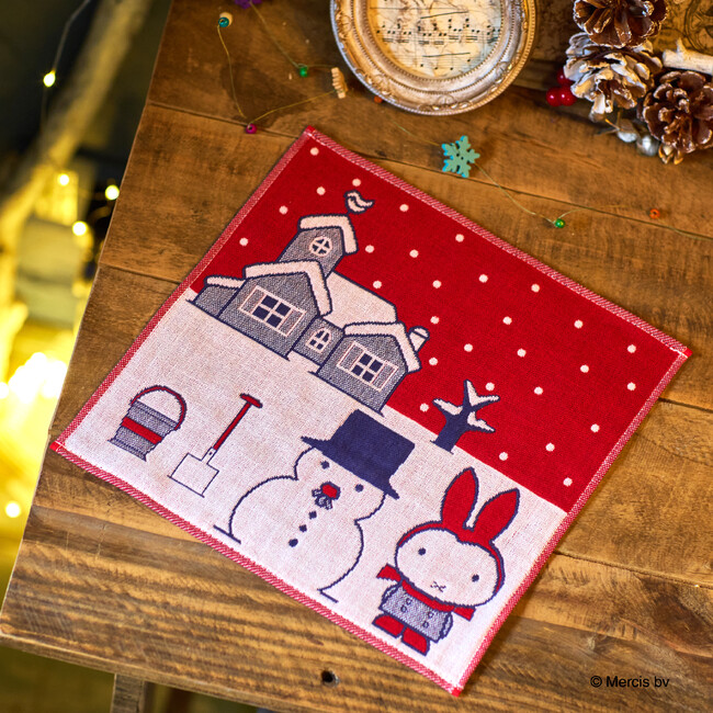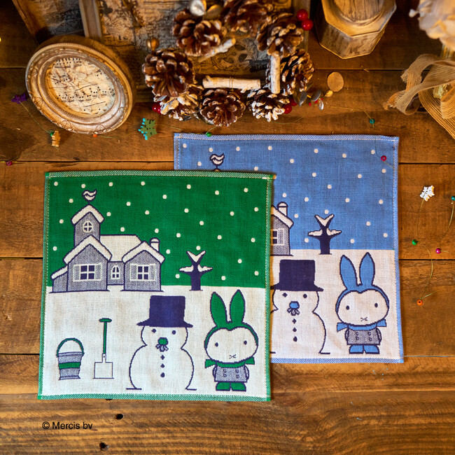 しんしんと降り積もる雪景色。ミッフィーと、絵本に登場するなかまたちをデザインした可愛らしいハンカチ。