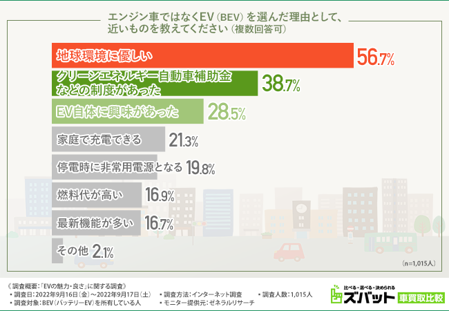 ・アンケート回答者1,015人のうち、「エンジン車ではなくEV(BEV)を選んだ理由」として、56.7%の人が二酸化炭素を一切排出しないEVは「地球環境に優しいから」と回答。