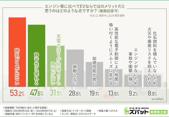 ・EVのメリットについては、「排気ガスが出ない(53.2%)」「静音性に優れる(47.6%)」「充電のほうが給油よりも費用が安い(31.5%)」といった回答が上位を占めた。