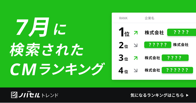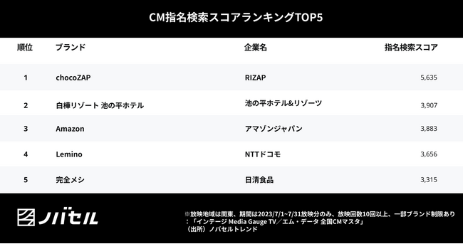 マーケティング情報の発信拠点となる「ノバセル オープンラボ」を運営するノバセル株式会社(本社:東京都品川区、代表取締役社長:田部正樹、以下ノバセル)は、テレビCM効果の分析サービス「ノバセル トレンド」を活用し、2023年7月に放映されたテレビCMの指名検索スコアランキングを発表いたします。