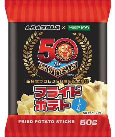 新日本プロレス50周年を記念して、人気商品「フライドポテト」のパッケージが、50周年ロゴ使用特別仕様パッケージになります。コラボ商品の監修をした3人の選手に加え、“100年に一人の逸材”棚橋弘至選手、 “制御不能なカリスマ”内藤哲也選手を加えた計10種のオリジナルカードが付いています。