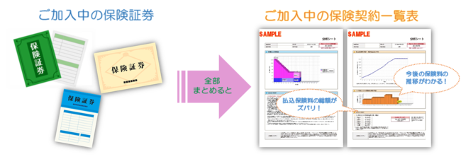 生命保険診断サービスとは、お客さまが現在ご加入している生命保険を分析・整理した「保険契約一覧表」を作成し、ご契約状況を分かりやすく説明させていただくものです。