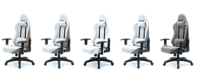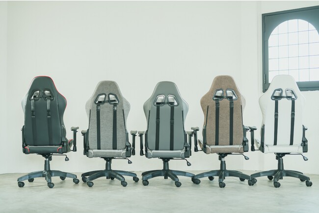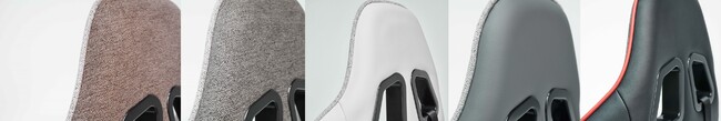 ブラウンとチャコールグレイ(上画像左の2つ)は前面・背面の両面をファブリックとした2カラーリングで、従来サイズのクロスフォーカスのブラウン、チャコールと同配色にすることで、例えば親子でお揃いのチェアを使用することもできます。その他の3カラーリング(上画像右の3つ)は、前面にファブリック、背面にPVCレザーを採用し、より洗練された印象をまとったデザインとしました。