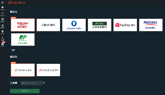 「即時入金」を選択していただくと、振込元・振込先・入金額の選択/入力画面が表示されますので、選択/入力をいただくことで、トライオートの取引ツール内で入金をいただくことができます。
