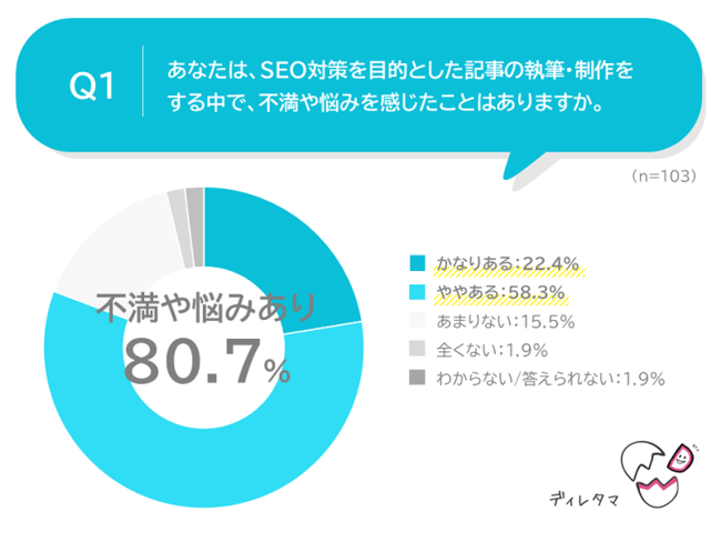 「Q1.あなたは、SEO対策を目的とした記事の執筆・制作をする中で、不満や悩みを感じたことはありますか。」(n=103)と質問したところ、「かなりある」が22.4%、「ややある」が58.3%という回答となりました。