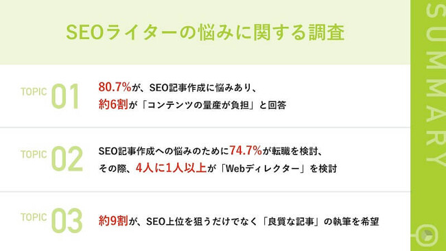 Webコンテンツの需要の高まりとともに、SEOライターの需要が増えました。しかし、コンテンツとライターの急増により、「コンテンツを生み出す苦しみ」をSEOライターが抱えているケースが多い実態が明らかとなりました。また、SEOを意識しすぎることにより、クライアントや自身が書きたい内容と実際書いている内容に乖離が生じてしまい、自身のキャリアに疑問を持つライターも少なくないようです。