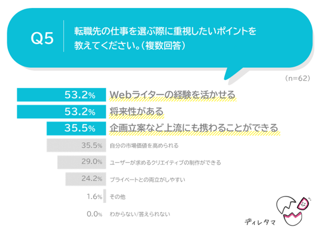 Q4で「かなりある」「ややある」と回答した方に、「Q5.転職先の仕事を選ぶ際に重視したいポイントを教えてください。(複数回答)」(n=62)と質問したところ、「Webライターの経験を活かせる」が53.2%、「将来性がある」が53.2%、「企画立案など上流にも携わることができる」が35.5%という回答となりました。