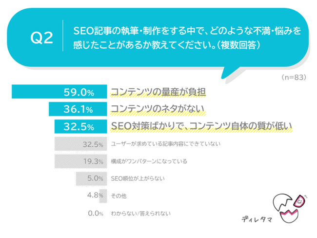 Q1で「かなりある」「ややある」と回答した方に、「Q2.SEO記事の執筆・制作をする中で、どのような不満・悩みを感じたことがあるか教えてください。(複数回答)」(n=83)と質問したところ、「コンテンツの量産が負担」が59.0%、「コンテンツのネタがない」が36.1%、「SEO対策ばかりで、コンテンツ自体の質が低い」が32.5%という回答となりました。