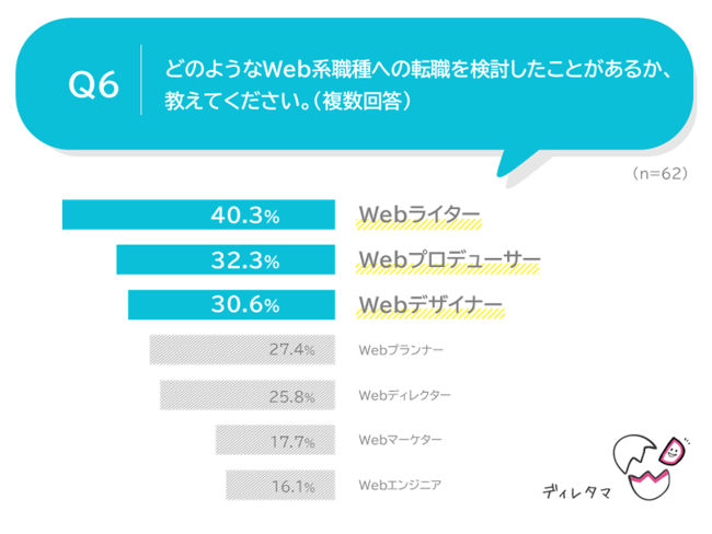 Q4で「かなりある」「ややある」と回答した方に、「Q6.どのようなWeb系職種への転職を検討したことがあるか、教えてください。(複数回答)」(n=62)と質問したところ、「Webライター」が40.3%、「Webプロデューサー」が32.3%、「Webデザイナー」が30.6%という回答となりました。