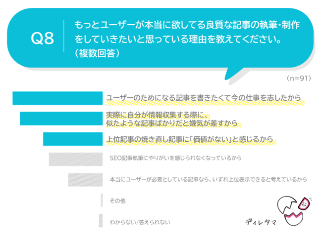 Q7で「かなりそう思う」「ややそう思う」と回答した方に、「Q8.もっとユーザーが本当に欲してる良質な記事の執筆・制作をしていきたいと思っている理由を教えてください。(複数回答)」(n=91)と質問したところ、「ユーザーのためになる記事を書きたくて今の仕事を志したから」が51.6%、「実際に自分が情報収集する際に、似たような記事ばかりだと嫌気が差すから」が47.3%、「上位記事の焼き直し記事に「価値がない」と感じるから」が34.1%という回答となりました。
