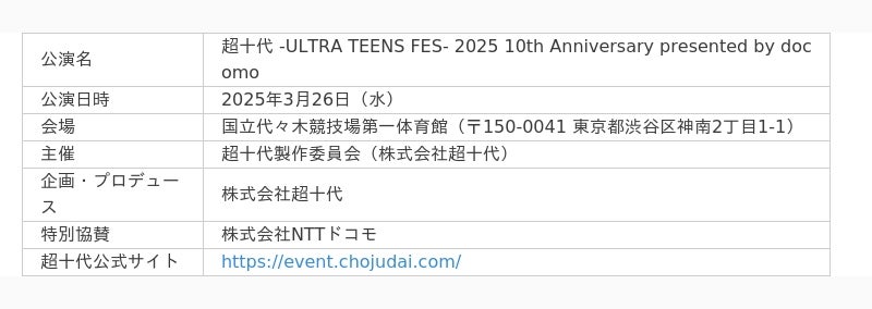 株式会社NTTドコモ(以下、ドコモ)は、株式会社 超十代(以下、超十代)が主催する「超十代 -ULTRA TEENS FES- 2025 10th Anniversary presented by docomo」(以下、本イベント)における冠スポンサーになることが2024年12月24日(火)に決定いたしました。