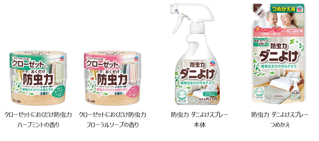 『防虫力』シリーズは、衣類用防虫剤『クローゼットにおくだけ防虫力』に加えて、衣類用ダニよけもリニューアルし、『防虫力 ダニよけスプレー』として新しく生まれかわりました。本スプレーは、ダニよけに加えて、除菌、防カビ、ウイルス除去、消臭、ダニの死骸やフンなどのハウスダスト除去成分配合の6つの特長があり、くらしを快適に保ちます※5。従来品と比べ、植物由来成分でダニよけ効果※6が約1ヵ月から約2ヵ月持続します。衣類はもちろん、ベビーベッド、ふとん・ベッド・まくら、カーペット・タタミ、布製ソファ・クッション、ぬいぐるみなどの使用にもおすすめです。