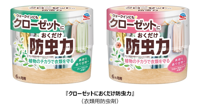 アース製薬株式会社(本社:東京都千代田区、社長:川端克宜、以下 「アース製薬」)は、8月1日(木)にウォークインクローゼットにも対応した収納空間内に置くだけで約6ヵ月間※1衣類を守り、消臭効果もある防虫剤『クローゼットにおくだけ防虫力(ボウチュウリキ)』を全国でリニューアル発売します。