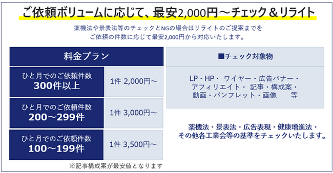 期間限定で、薬機法・景品表示法チェック&リライトを最安1件2,000円〜でご利用いただけます。
