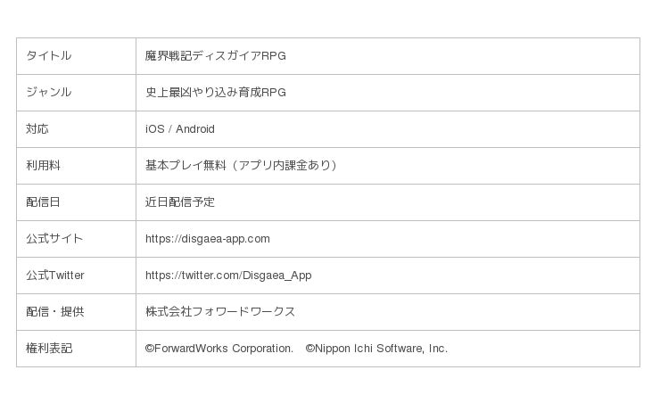 『魔界戦記ディスガイアRPG』は、シリーズの世界観や、やり込み要素を継承しながらも、「魔界戦記ディスガイア」シリーズの歴代キャラクターたちが登場するオリジナルストーリーや、いつでもどこでもサクサク遊べるコマンドバトルを採用するなど、スマートフォン向け完全オリジナルゲームならではの楽しさを実現いたします。