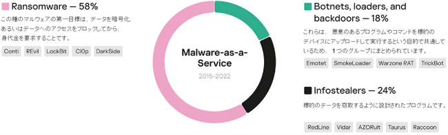 図1:MaaSモデルによって配布されたマルウェアファミリーの種類の分布と、その種類の中で最も使用されたファミリーの例※2(2015〜2022年、ソース:Kaspersky Digital Footprint Intelligence※1)