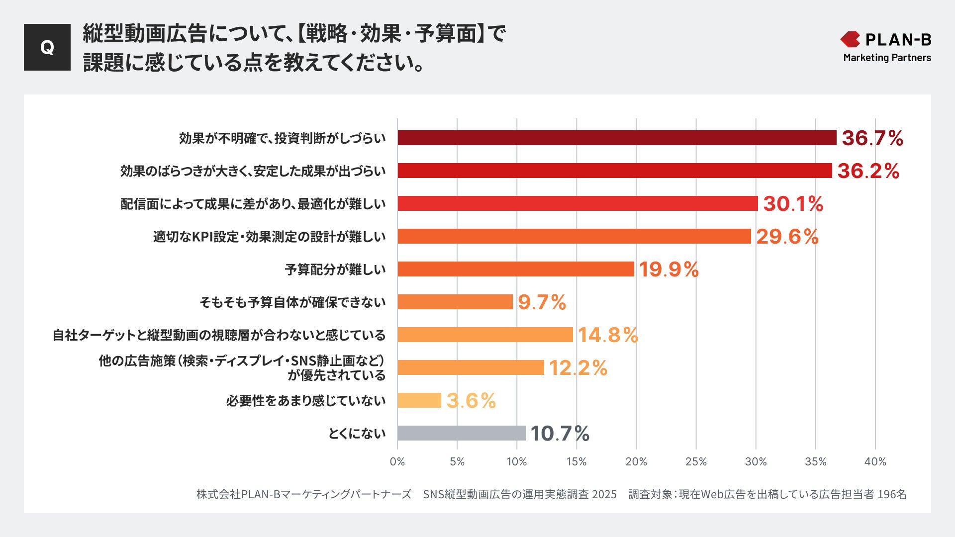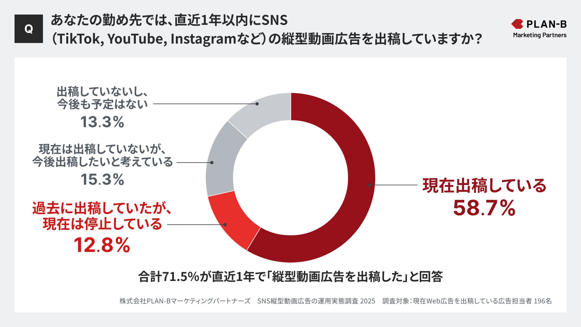 Web広告・SEOなどあらゆるデジタル領域のマーケティング支援を行う株式会社PLAN-Bマーケティングパートナーズ(東京都品川区、代表取締役:鳥居本 真徳)は、現在Web広告を出稿している全国の広告担当者196名を対象に、「SNS縦型動画広告の運用実態調査」を実施しました。