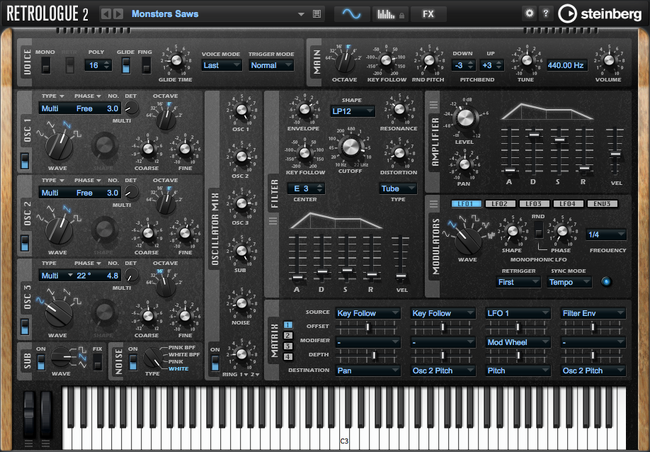 クラシックなアナログシンセサイザーの温かく太い音色を再現するRetrologue は、3基のオシレーターと一連のフィルターで、生々しいアナログリードやベース、はかなくデリケートなパッドやストラクチャー、攻撃的なコンピングパターンなど豊かで感性を触発する音色を生み出します。
