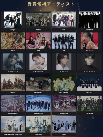 aespa / ATEEZ / BTS / ENHYPEN / EPEX / ITZY / IVE / チョ・ユリ / カン・ダニエル / クォン・ウンビ/ イ・ムジン / イム・ヨンウン / MIRAE / MONSTA X / NCT DREAM / NCT 127 / PURPLE KISS / SEVENTEEN / Stray Kids / THE BOYZ / TOMORROW X TOGETHER / TREASURE / TWICE