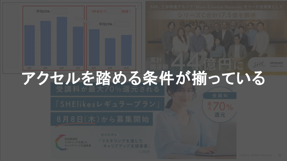 しかしそれだけでは非連続な成長はできない。そんな時newmo青柳さんの「唯一の後悔は踏める時に踏まなかったことだ」という言葉に背中を押され、SHEの投資タイミングを見極め、事業計画になかったTVCMを役員に直談判。