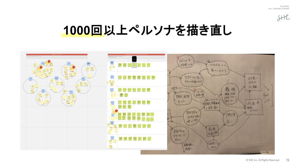 SHE転職後すぐは会議で「未達報告」の嵐。そんな中でも根気強く改善するため、広告運用をインハウス化し24時間張り付いて管理。自分がターゲットと異なる男性だからこそ、フラットな目線で1,000回以上ペルソナを描き直し、毎月300本以上のクリエイティブを制作する中で、徐々に目標達成できる土台を整備しました。