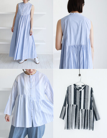 ブルーとホワイトの爽やかなストライプのノースリーブワンピースとブラウスは、甘くなりすぎないデザインで、春から夏にかけて活躍する清涼感のある着心地が魅力です。また、同型でリーフ柄が透けるランダムストライプのインドコットン素材のアイテムもご用意。
