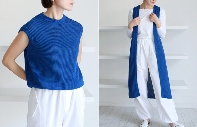 Knit vest / 23-02-31-02782 ¥26,400Knit gilet / 23-02-31-02781 ¥39,600すべて GALERIE VIE夏の定番品である、リネン100%の両畦編みのニットシリーズ。太陽の下で映えるロイヤルブルーは今回限りの別注カラーです。ベストは1枚で着ても、ジレはスタイリングをアップグレードするレイヤードアイテムとして。