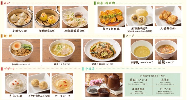 自家製小籠包などの点心類や揚げ物、麺・飯、デザートまで約50種類のこだわりのお料理を食べ放題コース、セットメニュー、アラカルトでご用意。また、ご来店のすべてのお客さまに厳選した本格中国茶を提供いたします。