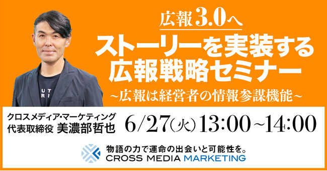 株式会社クロスメディア・マーケティング(本社:東京都渋谷区、代表取締役 美濃部哲也、以下クロスメディア・マーケティング)は、企業の経営者、経営企画責任者、PR・広報担当者向けに「広報3.0へ。ストーリーを実装する広報戦略セミナー」を、2023年6月27日(火)13:00よりオンラインにて開催いたします。