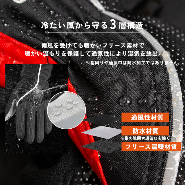 防水・防風性が高いので雨や雪のなかでも暖かさを維持。手の平には3mmのSBR耐震シリコンパッドを採用し、ハンドルからの細かい振動や衝撃を吸収し、長時間の走行もストレスを受けません。