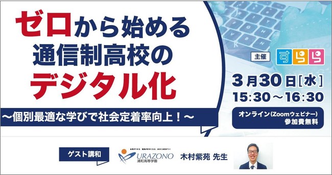 株式会社すららネット(本社:東京都千代田区、代表取締役社長:湯野川孝彦)は、2022年3月30日(水)に通信制学校の管理職ならびに教職員を対象とした無料オンラインセミナー「ゼロから始める通信制高校のデジタル化〜個別最適な学びで社会定着率向上〜」を開催します。