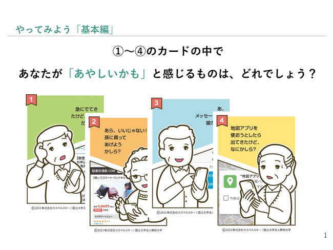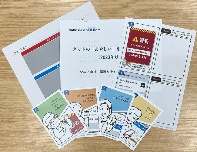 カスペルスキーと教育工学、授業デザインを専門とする静岡大学教育学部 塩田真吾研究室は、2018年に、シニアがインターネットを利用する際のトラブルを避けるために、リテラシーを高め、自らリスクを判断できることを目的としたカード教材「ネットの『あやしい』を見きわめよう(シニア編)」を共同開発しました。