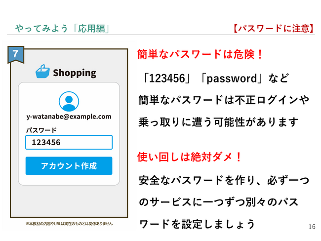 今回提供する最新版では、最近増加しているリスクを取り入れました。ウイルスに感染したなど嘘のメッセージを画面に表示して高額なサポート料金を請求する「サポート詐欺」、初めは無料でも一定期間を過ぎると課金が開始される「無料アプリ」のトラブルなど、シニアに身近な具体例を採用しています。また、パスワードの使い回しを避けるために、安全なパスワードの作り方のヒントも盛り込みました。