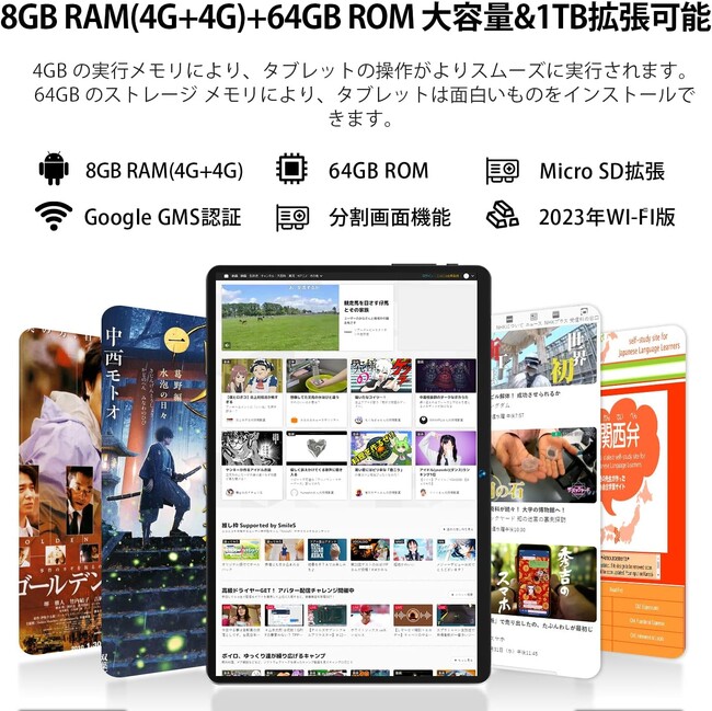 【大容量8GB(4GB+4GB拡張)+64GB+1TB拡張可能】BMAX I9Plus タブレットのメモリーは8GB、64GBの内蔵ストレージの元に、最大1TBまでのmicroSDカード/TF カード(FAT32フォーマットカードは別売り)の拡張可能なストレージです。容量を気にせずGoogle Playで 人気なアプリに対応でき、ビデオ、音楽、電子書籍、オンライン授業、ネットサーフィン、ゲームなど様々なエンターテイメントもこの一台で十分です。