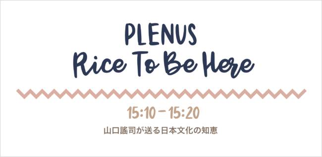 当社は、企業活動において1年間に日本で生産される米の約0.5%、約4万トンを使用しています。企業活動に欠かせない米は、食の西洋化や炭水化物の忌避などの理由で、年々消費量が減り続けています。米中心の食文化が薄れつつあることを懸念し、当社は「米文化継承活動」という取り組みを行っています。日本の歴史、伝統に密接に関わりのある米文化を守り、その素晴らしさを未来へつなげていくことを、ビジネスを通じて伝えるだけでなく、文化事業としても取り組み、情報の発信源を作りたいと考えています。その想いをコーナーのタイトル「PLENUS RICE TO BE HERE」に込めました。