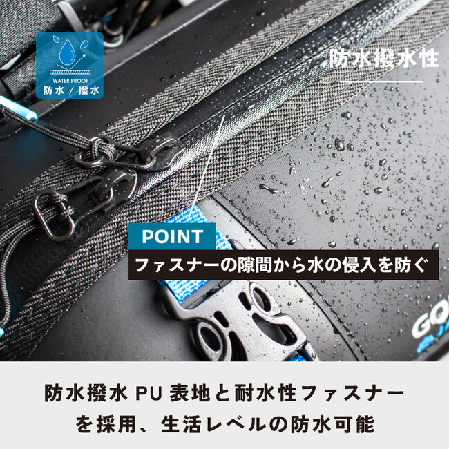 生地 耐水性EVAシェル(シェル厚み約5mm)、防水撥水加工PU表地、耐水性ファスナー
