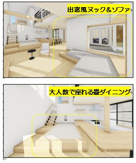 『四季ZEN+』の最大のポイントは、家族が1つの空間にいながらそれぞれが居場所を選んでくつろげる住宅設計になっているところです。まず1階リビングの一角に、出窓風ヌック&ソファを設けました。出窓風ヌックでは、外の景色を楽しみながら本を読み日向ぼっこができ、ソファでは壁を背にして隠れるように落ち着いた空間を過ごすことができます。その時の気分に応じて居場所を選べるような造りとなっています。さらに、小上がりの畳ダイニングでは、畳でくつろぐだけでなく、食卓や学習スペースとして使用し、多方向にいる人々とコミュニケ-ションを取ることも可能です。