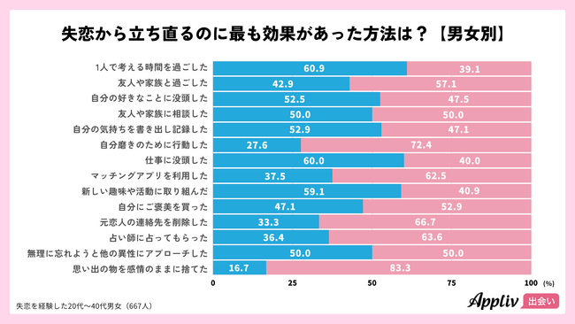 失恋を経験した人は、どのように立ち直り新しい恋愛をしていくのでしょうか。「Appliv出会い」では、失恋を経験したことがある全国の20代〜40代の男女667人を対象に、失恋後の行動についてアンケートを実施。