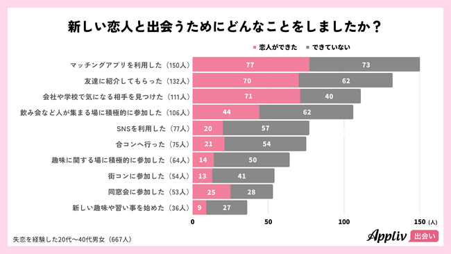 失恋後に新しい恋人と出会えた方法1位は「マッチングアプリ」、利用者の51.3%が交際に発展(Appliv出会い調査)