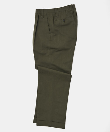 ドレスワイドパンツ「セントアイヴス」は、60年代のイギリス軍のNo.2ドレスパンツをベースに製作しました。印象的なベルトループなど原型にあるミリタリーのディテールを継承しつつ、スタイリスト四方章敬さんの考える理想的なシルエットや、ドレスディテールを融合した新感覚のワイドパンツです。ベースシルエットは人気アイテムであるオフィサーパンツ「ポーツマス」から再構築。テーパードからやりすぎていない品のあるワイドシルエットに変更。