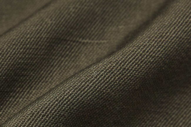 生地には、都会的な要素とリゾートテイストが共存した梳毛ウール×リネン素材を採用しています。経糸には、原料には繊維長の長い高級原料であるSUPER120Sを使用した80番手双糸の細番手ウール。緯糸には、60番手単糸のリネンを贅沢に打ち込んだ、ウールリネンのハイカウントギャバジンです。産地は日本の尾州。目付は230gと軽く、夏でも快適に穿けるウェイト、素材感の生地を採用しています。