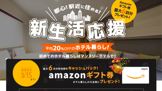 メトロエンジン株式会社(本社:東京都港区、代表取締役CEO:田中良介、以下メトロエンジン)と、BEENOS株式会社(東証一部:3328)の連結子会社で、日本の魅力を世界に拡げ、インバウンド市場成長の加速を支援するBEENOS Travel(ビーノス トラベル)株式会社(代表取締役社長:竹内 拓、以下BEENOS Travel)が運営する、7泊以上の長期予約がリーズナブルな長期滞在専門予約サイト「Monthly Hotel(マンスリーホテル、URL:https://monthlyhotel.jp/)」は、2022年3月1日(火)〜3月15日(火)中に予約を30泊以上し、宿泊された方を対象に最大6泊分のAmazonギフト券をプレゼントするキャンペーンを実施いたします。