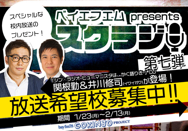 関根勤&井川修司が学校のお昼に笑顔をお届け!!/「ベイエフエム presents スクラジ!」第7弾放送校募集中!