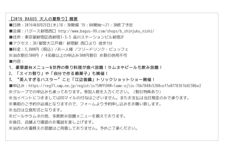 ダイヤモンドダイニンググループの株式会社バグース(本社:東京都港区、社長執行役員:矢口 健一)は、8月25日(木)19時よりバグース新宿西口店にて「大人の夏祭り」を開催する運びとなりました。イベントでは、贅沢にアレンジした屋台メニューや世界の祭り料理を、食べ放題にて提供いたします。また「すいか割り」や「自分で作る綿菓子」なども予定しております。イベント中は施設を開放しダーツやビリヤードで遊べる他、“美人すぎるハスラー”でTVなどにも出演の江辺香織さんのショーも開催するなど、盛りだくさんな内容となっております。