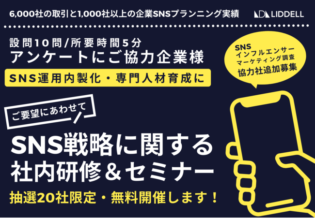 インフルエンサーマーケティング事業を展開するLIDDELL株式会社(本社:東京都港区、代表取締役:福田 晃一、以下リデル)は、『SNS・インフルエンサーマーケティングにおける活用実態や意識調査』を実施しております。アンケートにご協力いただいた企業の中から20社限定で、ご要望にあわせて「SNS戦略に関する社内研修&セミナー」を無償実施いたします。SNSマーケティングの内製化をご検討されている企業は、ぜひこの機会ご活用ください。