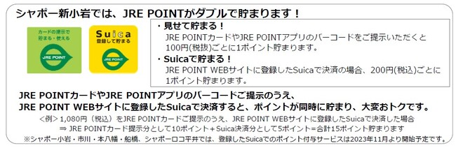 ご入居者さまがシャポー新小岩でお買い物の際、JRE POINTカードやJRE POINTアプリのバーコードをご提示いただくと、いつでも100円(税抜)につき2ポイントが付与されます。