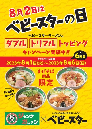 内容:「ジャンクガレッジ」のまぜそば商品限定でベビースターラーメンのダブル・トリプルトッピングをお選びいただけます。