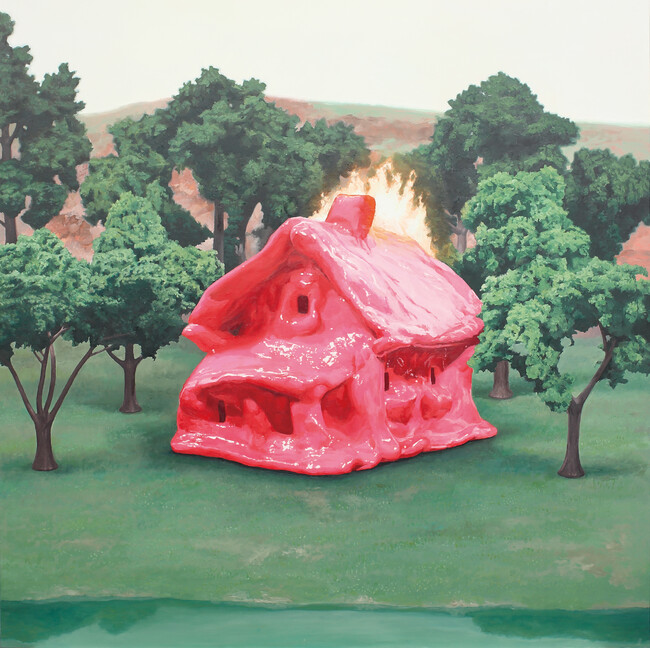 今回の作品ではSNSなどで見られる炎上をテーマに作品を制作しました。歪んだ家のようなモチーフは、まるで欲望が肥大化したかのように醜く歪んだ造形になっています。作品を見る視線は、画面の中の家を対岸の火事として見る視線と重なります。悲壮感や切迫感のない様子は日常的に炎上を見慣れている私たちの無関心な目線そのものかもしれません。
