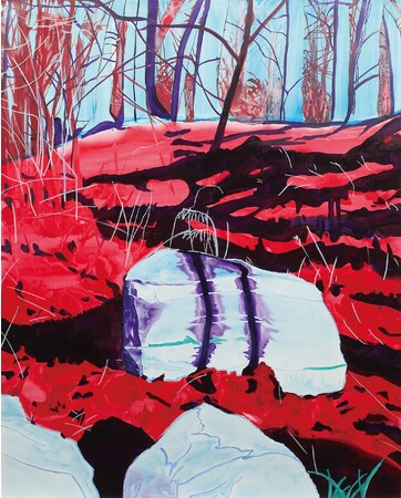 この絵はNY郊外の森を明け方散歩していた時に観た景色になります。その日は陽が高く、緑が濃すぎて私の目には真っ赤に見え、影は長くそこに染み込んだように黒くジワッと刻みこまれていました。日本に帰って来てから、あの時の自然の中の不自然さや感じた違和感を絵にしたいと思い、写真やドローイングをもとに描き始め、跳ねたり飛んだ絵の具の滲みなどコントロールできない部分はそのままに一気に描き上げたこの絵は写真よりもリアルにその時の記憶を現してくれました。